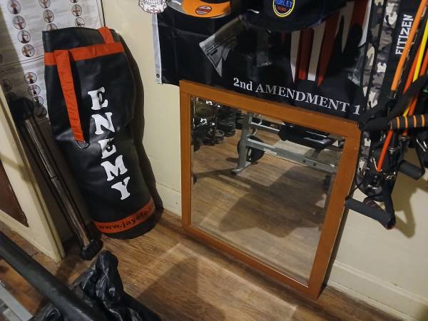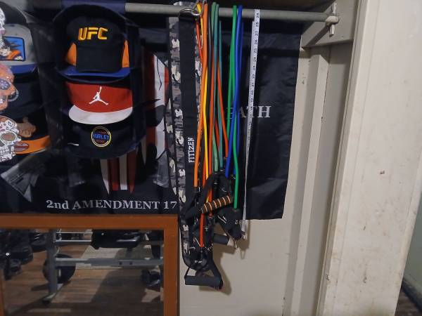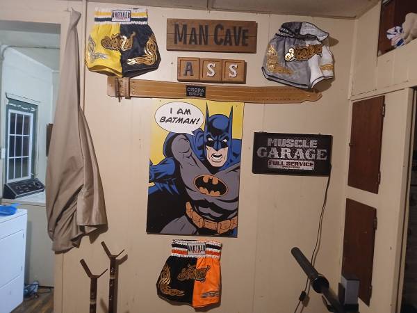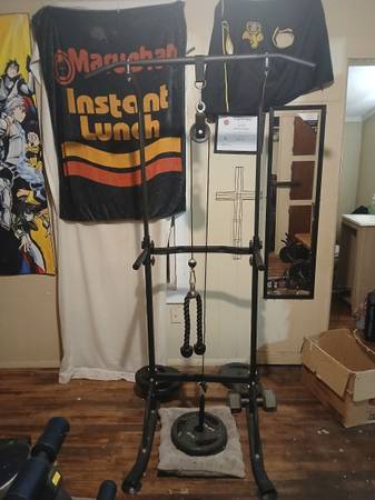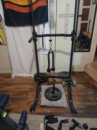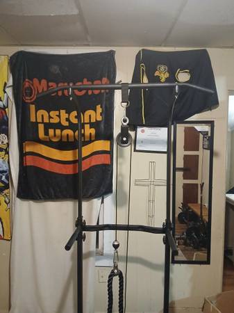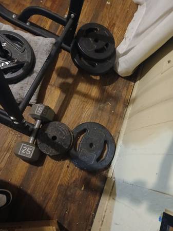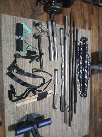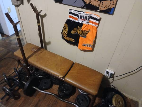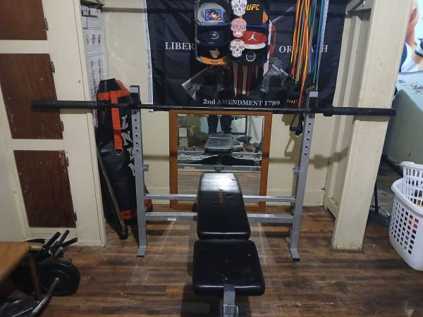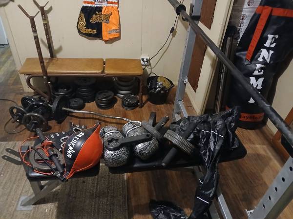 Complete gym full size punching bag boxing gloves three benches over 700 lb of weights Olympic and standard size tons of different barbells everything pictured including all posters and pictures on...