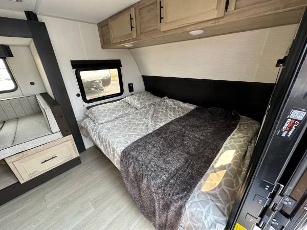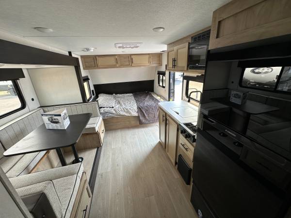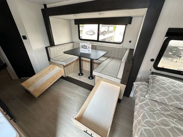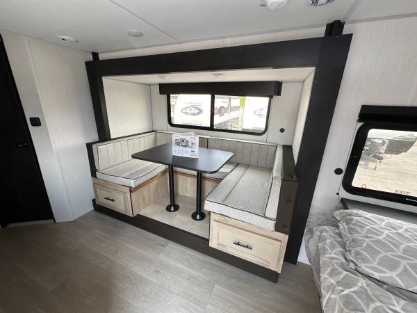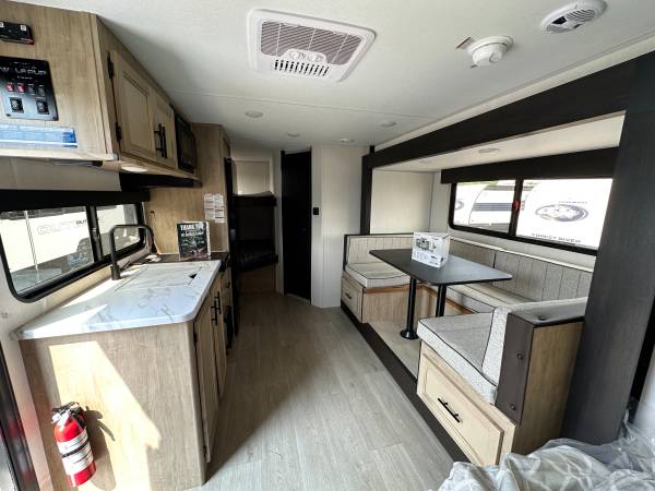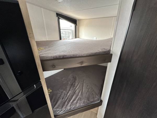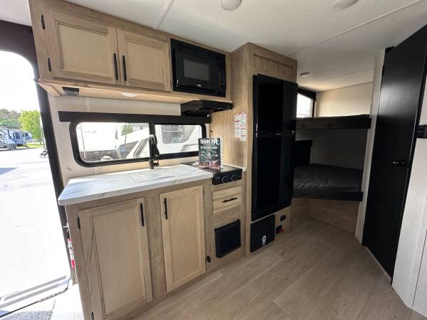 This family travel trailer is ready to head to the campground whenever you are! The kiddos can sleep on the set of double-size bed bunks and you can sleep on the front queen bed, plus the U-shaped dinette slide can also transform into an extra sleeping space when you aren't using it to enjoy a meal prepared with the high output cooktop. You can also prepare your delicious meals at the outside mini kitchen and stay protected by the power awning. The exterior not only has outside storage and an outside TV mount, but also features an outside storage plus door for access to the storage space underneath the bottom bunk bed. The rear corner bath allows everyone to stay clean and refreshed while you camp.